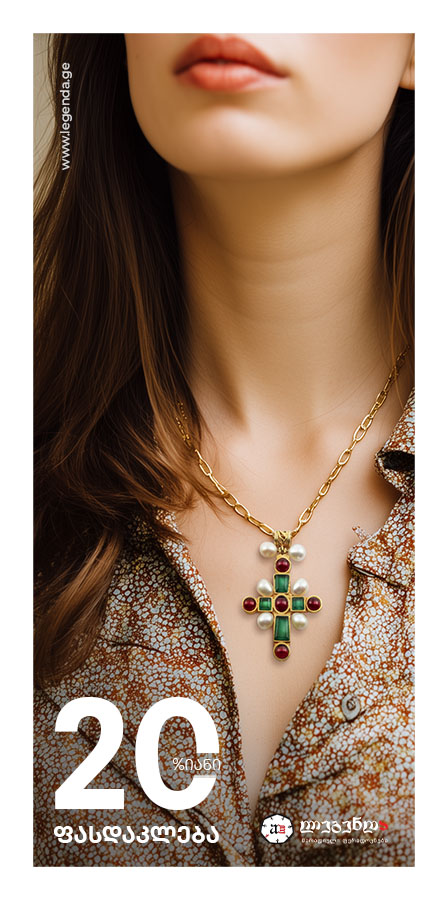 მასალა: მოოქროებული ვერცხლი, ძვირფასი ქვები (ავანტურინი, ძოწი), მარგალიტი.